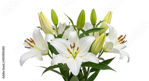 A cluster of white lilies with green leaves showcasing delicate details on transparent background