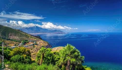 coast, ocean, sea, water, blue, green, landscape, viewpoint, sky, cloud, tropical, nature, scenic, paradise, travel, view, mountain, island, vegetation, picturesque, environment, wild, tour tourism, beauty, remote, cliff, peaceful, exotic, background, ai, generated