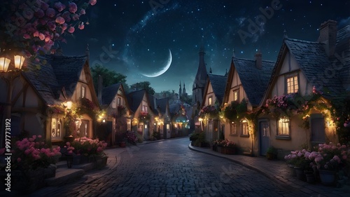 A cobblestone village street at night, with cozy cottages adorned with flowers, glowing lanterns, and a crescent moon hanging in the starry sky.