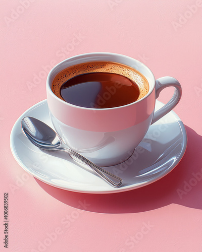A coffee cup with a saucer and a spoon, isolated on a pastel background,