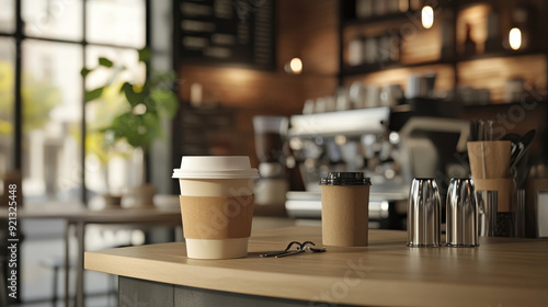 A coffee shop interior featuring a table with "coffee to go" cups and various accessories, such as sugar packets, stirrers, and napkins. The background showcases the café's cozy atmosphere