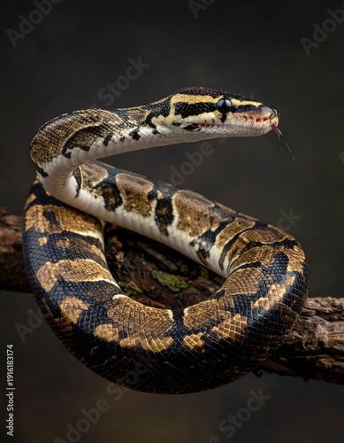 snake, reptile, animal, wildlife, nature, photo, closeup, tree branch, tree, brown, black, yellow, pattern, scale, eye, tongue, dark, blurred, background, coiled, curved, body, texture, skin, wild, creature, danger, predator, carnivore, fauna, flora, forest, habitat, serene, still, quiet, mysterious, eerie, shadow, lighting, contrast, detailed, sharp