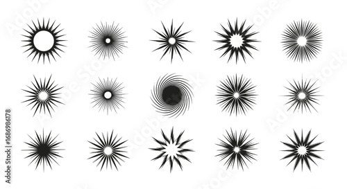 A collection of abstract sunburst and starburst graphic elements in black and white