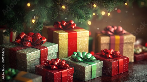 A collection of beautifully wrapped Christmas gifts under a tree with colorful bows and glittering paper