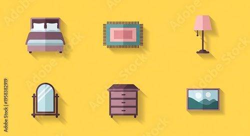 bed, rug, lamp, dresser, mirror, picture, furniture, decor, bedchamber, interior, design, illustration, colourful, minimalist