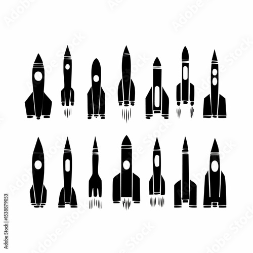 rocket, space, flight, launch, vector, illustration, black, white, design, silhouette, transportation, travel, exploration, future, technology, science, universe, adventure, galactic, engine, fuel, blast, propulsion, journey, astronaut, cosmic, star, galaxy, isolated, symbol, icon, graphic, shape, collection, set