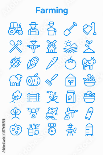 A collection of blue outlined icons depicting various farming elements and agricultural activities.