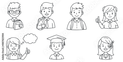 A collection of cheerful student characters in black and white outline vector style, perfect for educational materials and youth-focused projects