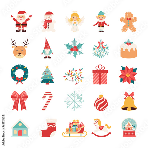 A collection of Christmas icons including Santa, angel, elf, reindeer, gingerbread man, and a Christmas tree