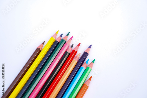 A collection of colored pencils arranged diagonally against a white background