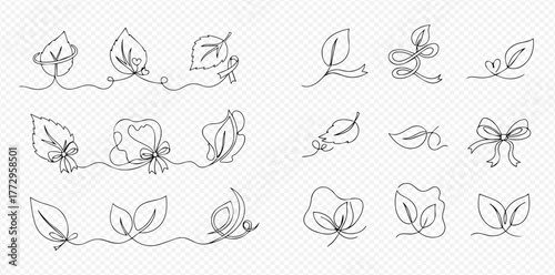 A collection of continuous line art illustrations featuring leaves and decorative bows, suitable for design elements.