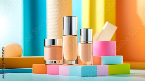 A collection of cosmetic bottles displayed on colorful blocks against a bright backdrop, featuring various skincare or makeup products. Concept Cosmetic Design Inspiration, Vibrant Product Display