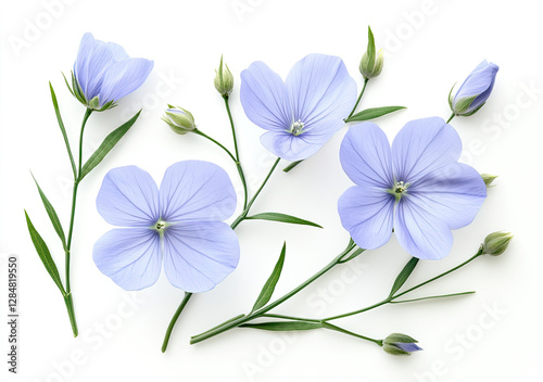 A collection of delicate light blue flowers with buds and green stems on a white background.