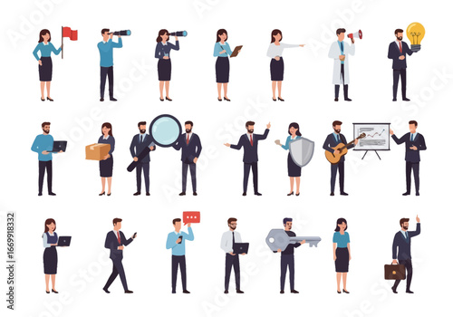 people, business, cartoon, character, illustration, professional, occupation, job, men at work, employee, manager, leader, team, teamwork, corporate, success, achievement, goal, strategy, vision, direction, flag, telescope, laptop, clipboard, pointing, megaphone, light bulb, box, magnifying, glasses, shield, guitar, chart, presentation, key, briefcase, standing, suit, attaching, skirt, shirt, pant, woman, man, beard, hair, office, work