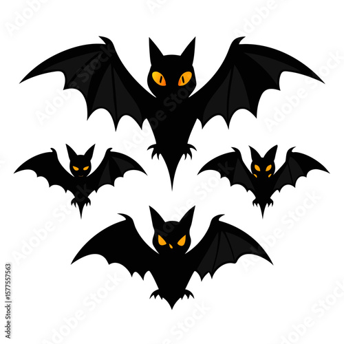 A collection of five black cartoon bats with glowing orange eyes flying against a white background