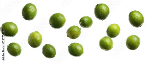A collection of fresh green limes scattered on a white background.