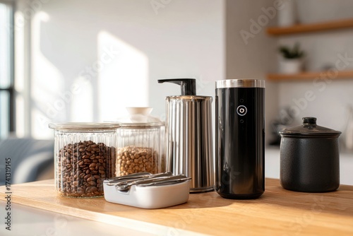 kitchen, countertop, item, natural, light, lifestyle, shot, hot drink, bean, clear, jar, glasses, ribbed, soap, dispenser, black, grinder, cylinder, silver, ceramic, container, small, white, tray, accessory, indoor, modern, minimalist, design, home, living, style, simple, clean, organised, aesthetic, elegant, cosy, warm, inviting, functional, everyday, detail, arrangement, composition, studio, photo, sharpened, background