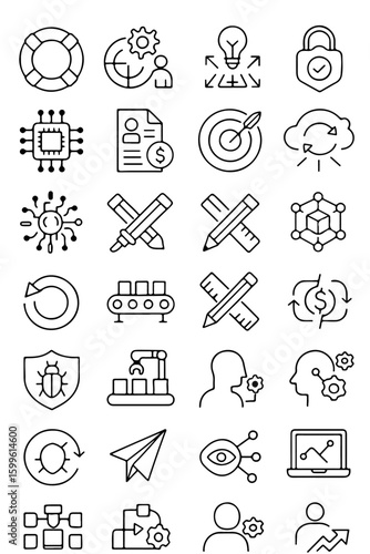 A collection of modern and clean line art icons, covering diverse business, technology, and innovative concepts. Ideal for illustrating complex ideas with elegant minimalism.