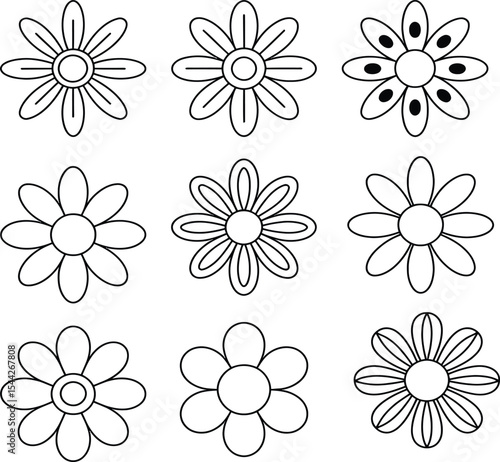 A collection of nine simple black and white flower drawings in a grid pattern on a white background