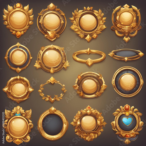 A collection of ornate golden emblems with intricate details, gemstones, and decorative designs, ideal for fantasy games, royal crests, or luxury-themed creative projects.