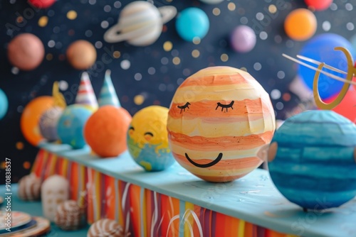 A collection of paper planets arranged on top of a table, Space-themed birthday party with smiling planets, AI Generated