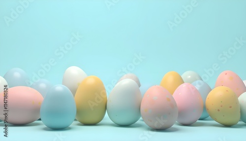 A collection of pastel-colored Easter eggs is artfully arranged on lush green grass, surrounded by tiny white flowers against a soft blue background, capturing the essence of spring