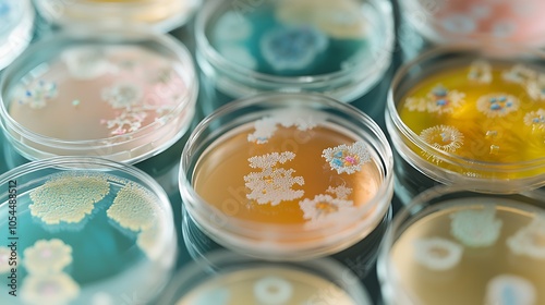 A collection of Petri dishes with growing bacterial cultures. Investigating microbial life through observation.