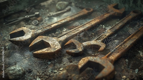 A collection of rusty old tools lying in a dusty cobweb-covered shed The tools are worn and weathered hinting at a long history of use and neglect