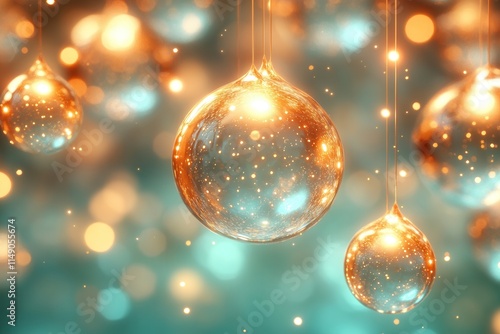A collection of shimmering glass ornaments glowing against a soft, colorful background.