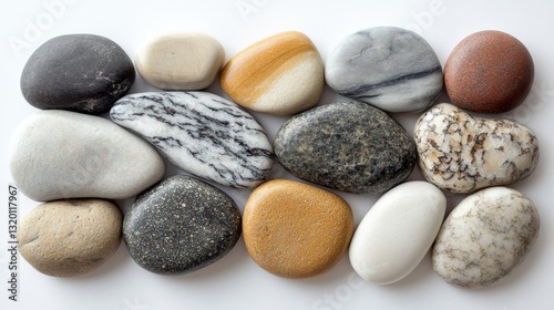 A collection of smooth and colorful pebbles against a white background