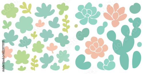 A collection of stylized succulents and leaves in pastel colors, perfect for design projects.