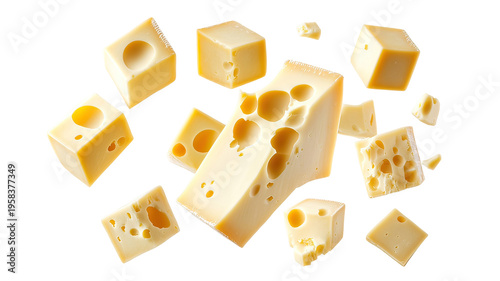 A collection of Swiss cheese cubes floating in mid-air on transparent background