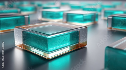 A collection of teal-colored, glassy square blocks, with light amber-colored accents, creates a futuristic and technological aesthetic.
