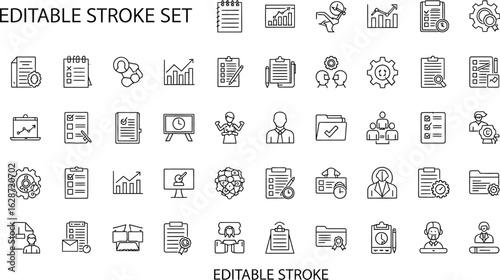 icon, line, business, management, task, clipboard, checklist, gear, graph, document, user, team, clock, time, folder, report, presentation, monitor, brain, search, electronic mail, award, notepad, growth, magnifier, group, planning, strategy, project, meeting, success, analysis, deadline, organisation, process, review, schedule, statistic, solution, editable, stroke