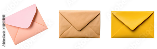 A collection of three colorful envelopes in pastel pink isolated on transparency PNG background, brown, and yellow, Perfect for illustrating themes of communication, correspondence