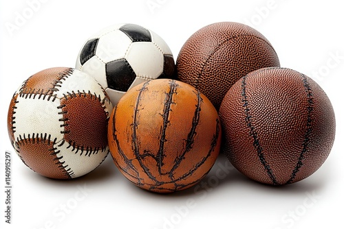 A collection of various sports balls, such as a rugby ball, basketball, soccer ball, volleyball, baseball, and tennis ball, isolated on a transparent background.