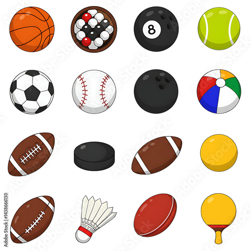A collection of various sports equipment including balls and a badminton birdie on a black background on transparent background