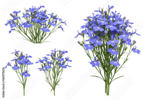 A collection of vibrant blue lobelia flowers with green stems and leaves, isolated on a transparent background