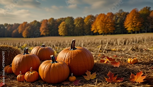 A collection of vibrant pumpkins rests on straw in an expansive field, surrounded by colorful autumn trees. The warm hues of fall foliage create a picturesque seasonal atmosphere