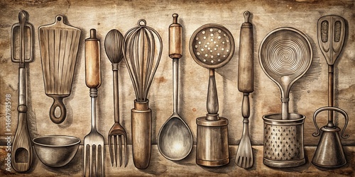 vintage, kitchen, utensil, cooking, tool, hanging, rustic, brown, wall, monochrome, sepia, illustration, drawing, vignetting, antique, old, design, culinary, food, preparation, equipment, domestic, home
