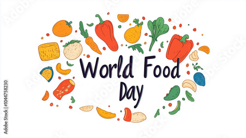 A colorful and festive illustration of various food items arranged in a heart shape, with the text "World Food Day"