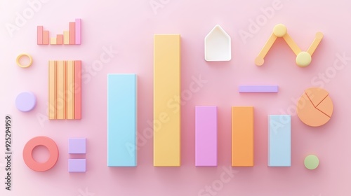 A colorful arrangement of geometric shapes representing graphs and charts on a pink background, showcasing various forms and a playful aesthetic.
