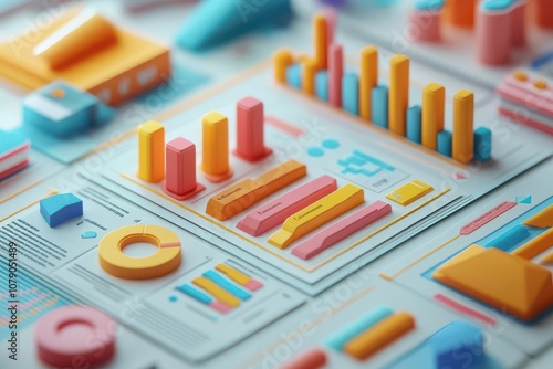 A colorful array of 3D graphs and charts representing data analysis and statistics, showcasing various data visualization techniques.