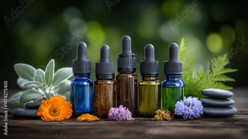 A colorful array of herbal essential oil bottles is placed in a thriving garden, surrounded by an abundance of greenery and blooming flowers, representing the harmony of natural beauty and wellness