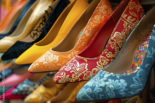 A colorful array of high-heeled shoes with different patterns on display, AI generated, shoes
