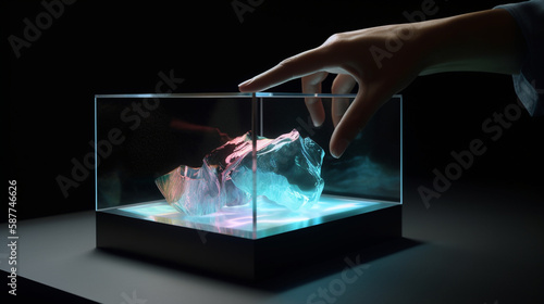 A colorful array of of shaped lights trapped in a glass box, forming holographic waves as a symbol of technology - Generative AI