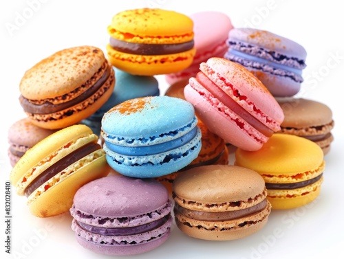 A colorful assortment of French macarons in various flavors stacked together on a white background. Perfect for dessert-themed designs and food enthusiasts.