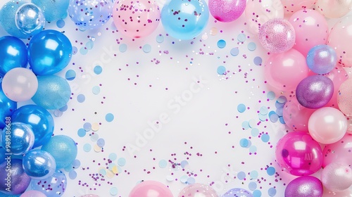 A colorful balloon arch with glitter and confetti on a white background, shown from a top view. A birthday party frame border with pastel pink