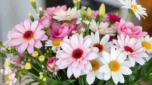 flower, bouquet, floral arrangement, pink, white, yellow, daisy, rose, closeup, summer, spring, nature, bloom, blossom, vibrant, fresh, decorative, arrangement, flora, garden, gift, celebration, floral, romantic, beautiful, colourful, still life, art, still, life, table, photo, image, picture, decoration, detail, natural, macro, bright, positivity, happiness, joy