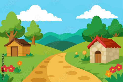 house, landscape, village, home, vector, cartoon, tree, summer, sky, nature, illustration, grass, farm, building, bungalow, spring, sun, rural, architecture, field, country, hill, scene, cloud, town